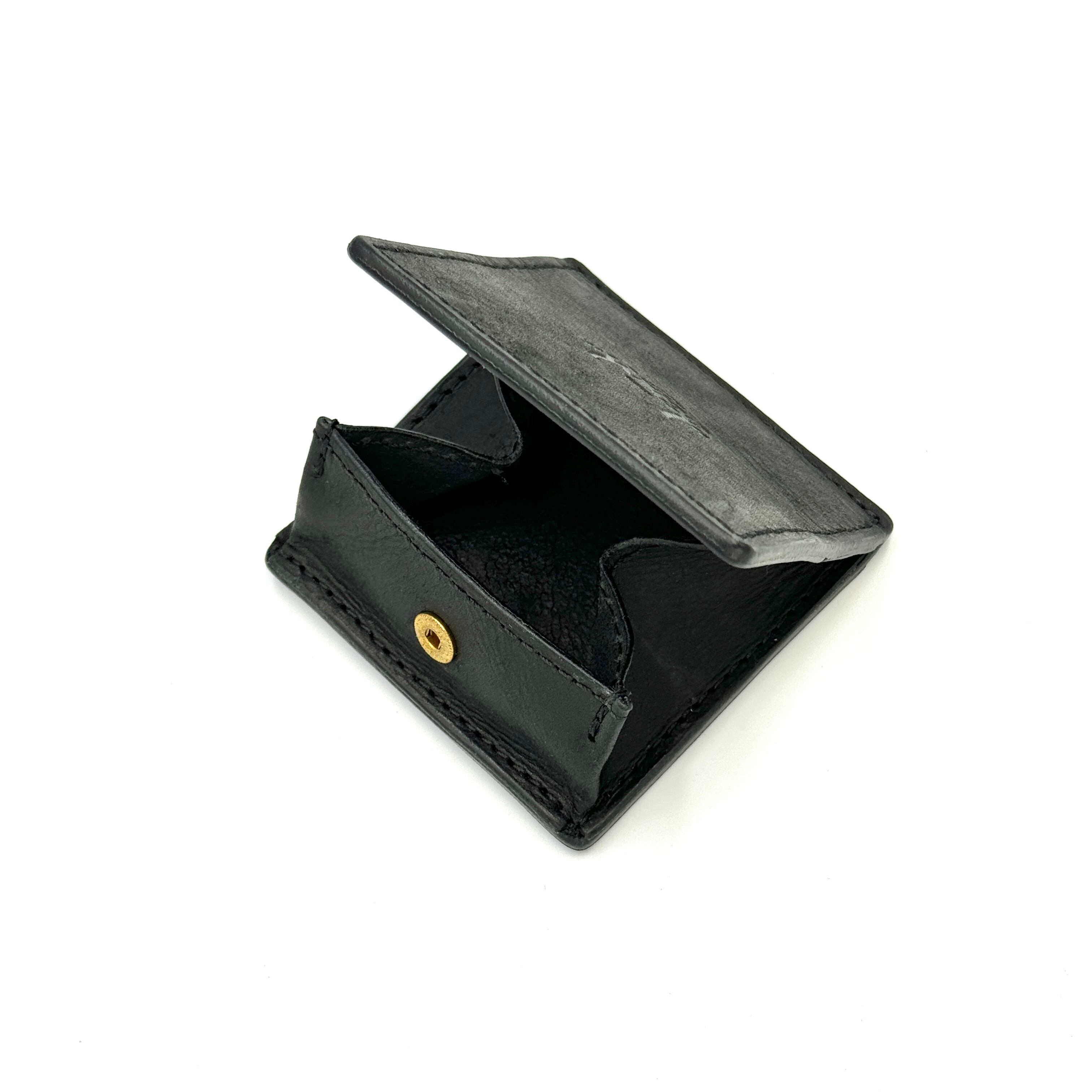イタリアスクラッチレザーで作られたYONZYBOX小銭入れ。ブラックカラーはどんなスタイルにも合わせやすく、大人の雰囲気を演出します。