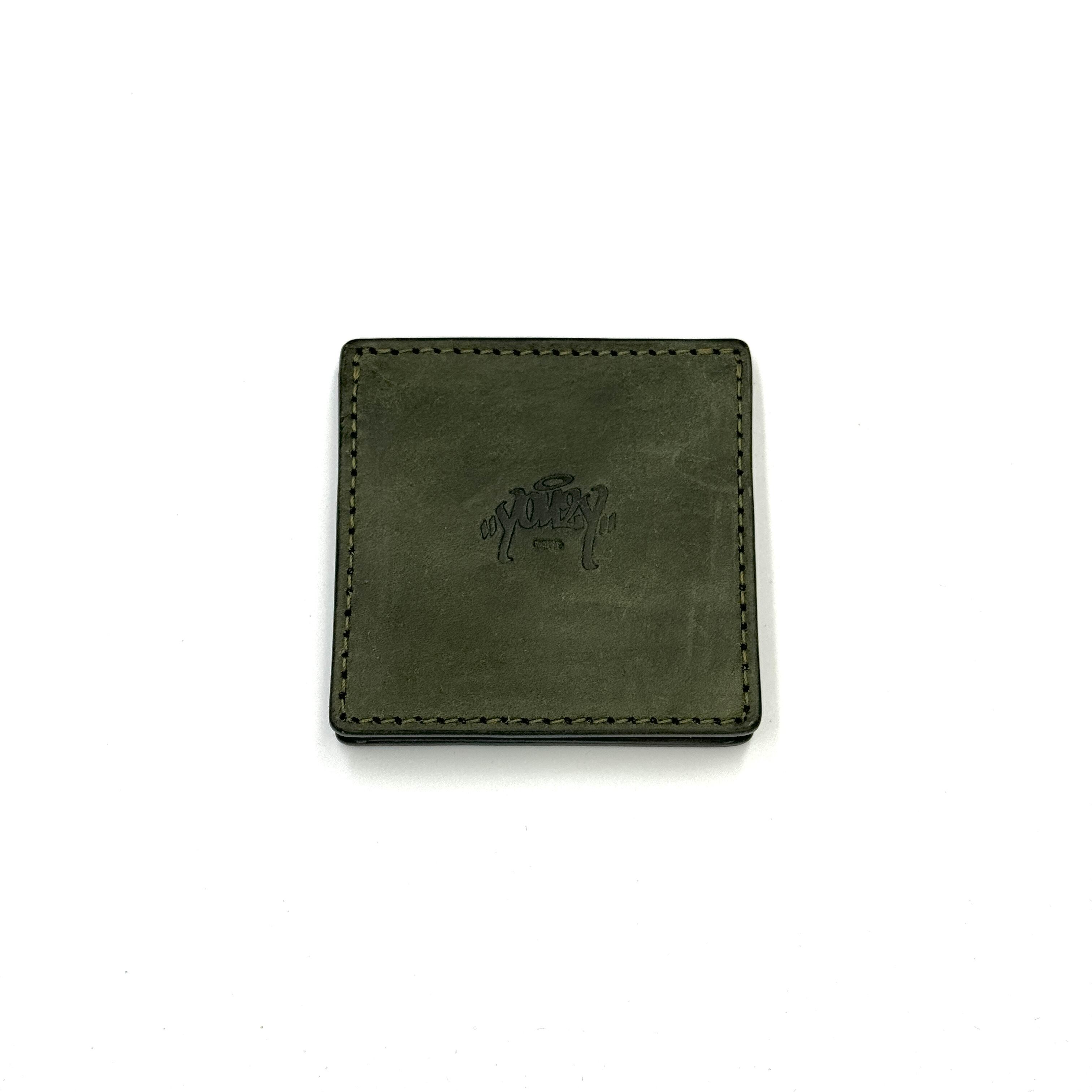 イタリアスクラッチレザーで作られたYONZYBOX小銭入れ。グリーンのカラーバリエーションは、落ち着いた雰囲気を演出し、男女問わず幅広いシーンにマッチします。シンプルなデザインながらも、独特のエイジング加工により、経年変化で味わい深い風合いになります。