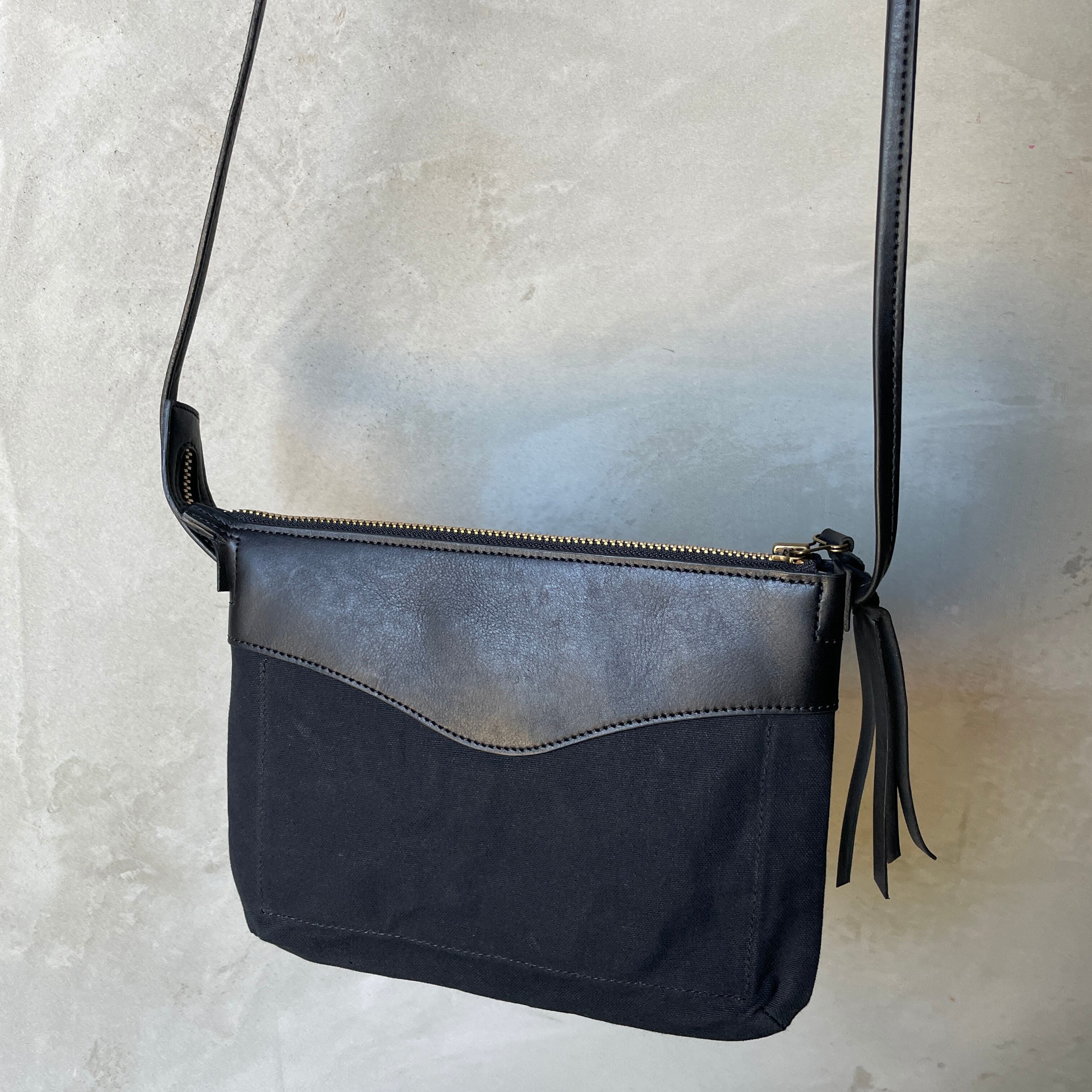 Title: ORTEGAレザー×撥水帆布サコッシュ BLACK Brand:YONZY Material:牛革/撥水帆布 Color:BLACK Size:ボディ 20×25cm 2cm奥行き ベルト長さ:〜120cmまで調節可能 Zipper:WALDES zipper
